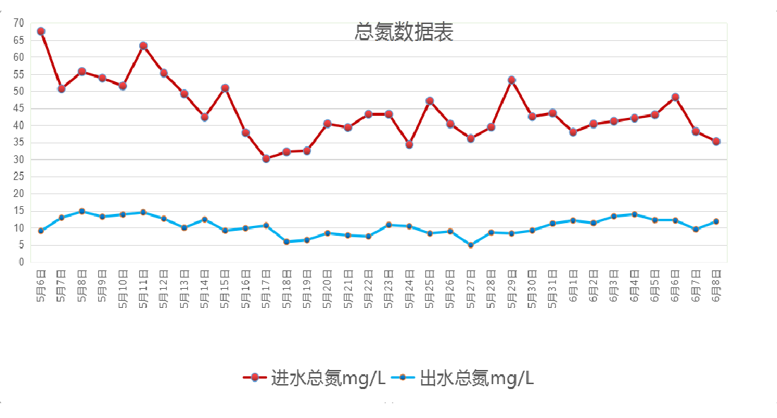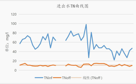 注:進水(shuǐ)總氮均值:67 mg/L ,出水(shuǐ)總氮均值:10 mg/L。