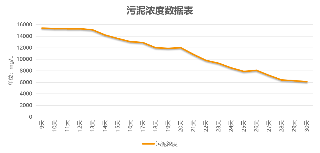 根據檢測數據可(kě)知,污泥濃度由15600mg/L降爲6100 mg/L,即污泥濃度較使用(yòng)生物(wù)菌劑前減少(shǎo)39%,污泥減量效果明(míng)顯。